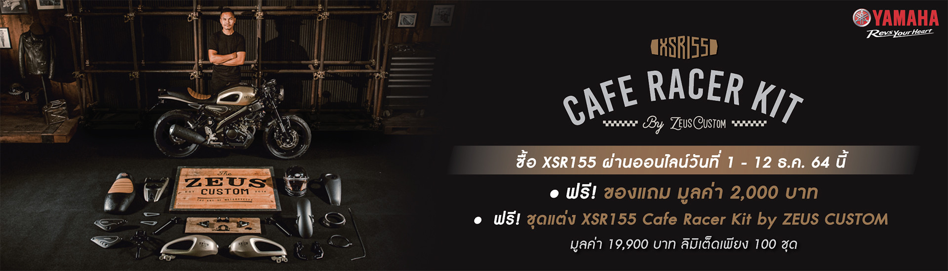 มองผ่านๆนึกว่าตัวโชว์ ที่ไหนได้มีป้ายตั้งอยู่ บอกชัดๆ “แถมฟรีชุดแต่งรอบคัน” จากสำนักคัสตอมชื่อดัง Zeus Custom ในสไตล์คาเฟ่ต์เรซเซ่อ โดดเด่นด้วยแฮนด์หมอบสุดเท่ และถังน้ำมันสีไทเทเนียม.. พิเศษเฉพาะลูกค้า Yamaha ที่ลงทะเบียนจับจอง Yamaha XSR155 ออนไลน์ 100 คันแรกเท่านั้น รวมมูลค่ากว่า 19,900 บาท! ลองไปดูซิว่าได้อะไรมาบ้าง..