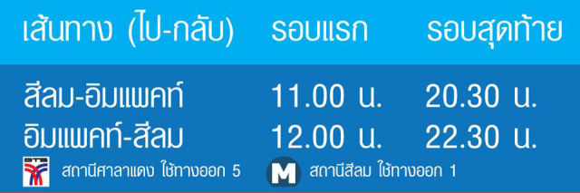 -สีลม-อิมแพ็ค-สีลม -รอบแรกเวลา 11.00 น.-รอบสุดท้ายเวลา 20.30 น.