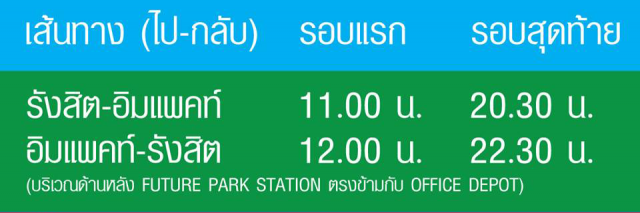 สถานีต้นทาง: รังสิต-อิมแพคท์-รังสิต จุดจอดรับส่ง ฟิวเจอร์พาร์ค รังสิต ลานจอดรถตู้ หน้าห้างบิกซี - เส้นทาง: ฟิวเจอร์พาร์ครังสิต-อิมแพ็ค-ฟิวเจอร์พาร์ครังสิต -รอบแรกเวลา 11.00 น. -รอบสุดท้ายเวลา 20.30 น.