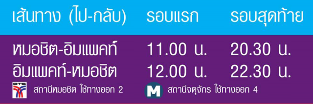 - เส้นทาง: หมอชิต-อิมแพ็ค-หมอชิต -รอบแรกเวลา11.00 น. -รอบสุดท้ายเวลา 20.30 น.