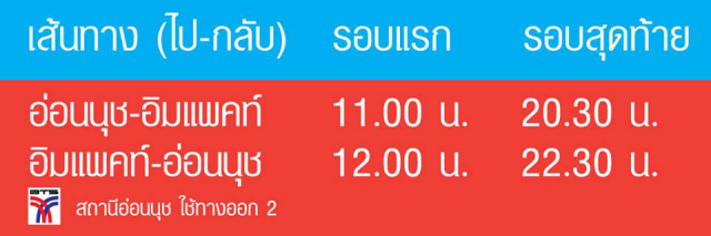 - เส้นทาง: อ่อนนุช-อิมแพ็ค-อ่อนนุช -รอบแรกเวลา 11.00 น. -รอบสุดท้ายเวลา 20.30 น.