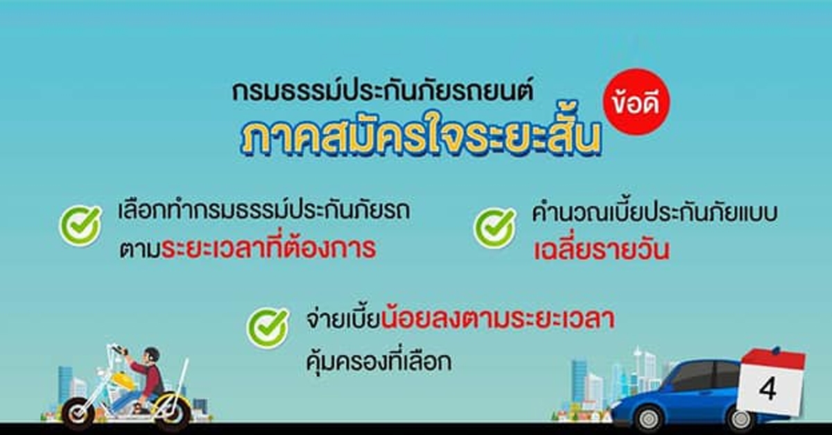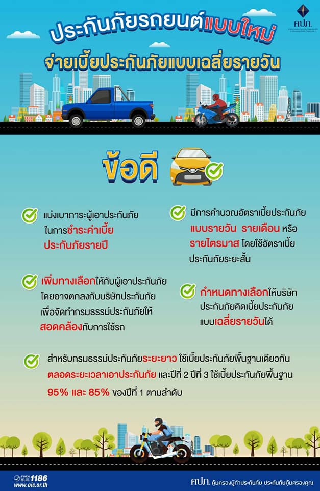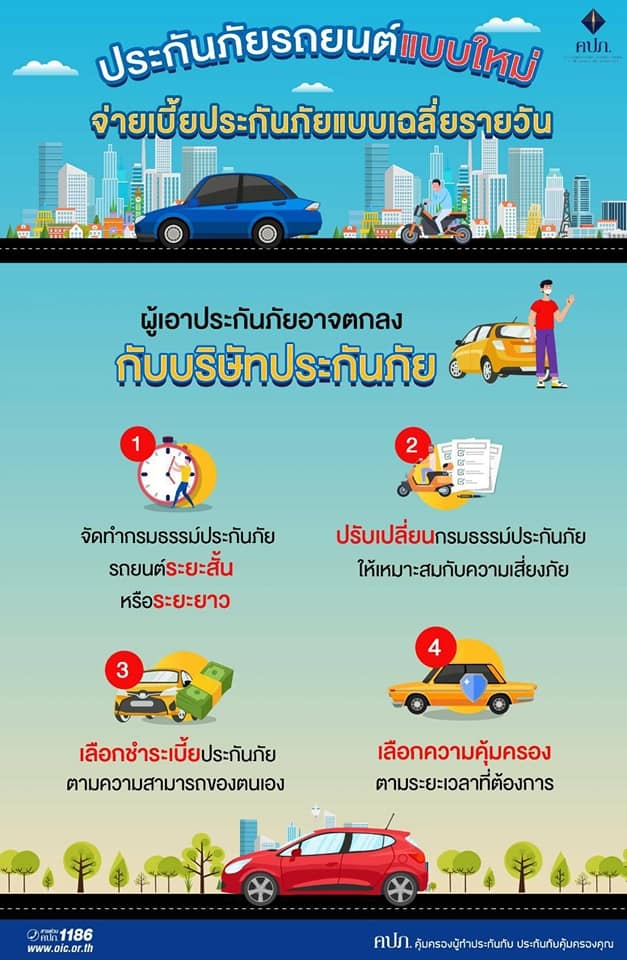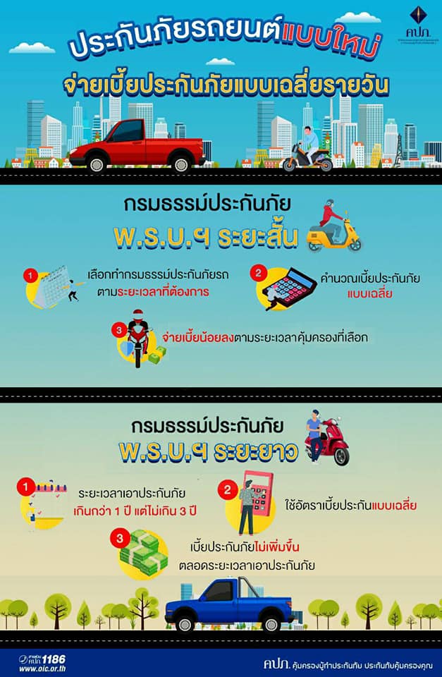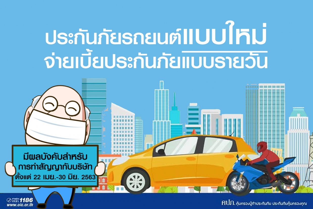เลขาธิการ สำนักงานคณะกรรมการกำกับและส่งเสริมการประกอบธุรกิจประกันภัย [คปภ.] ในฐานะนายทะเบียนได้ลงนามในคำสั่งนายทะเบียนที่ 31/2563 เรื่อง ให้ใช้แบบ ข้อความกรมธรรม์ประกันภัย และพิกัดอัตราเบี้ยประกันภัยรถยนต์แบบรายวัน รายเดือน รายไตรมาส หรือระยะยาวฯ เพื่อผ่อนผันเงื่อนไขและอัตราเบี้ยประกันภัยของกรมธรรม์ประกันภัยรถยนต์ โดยอนุญาตให้บริษัทประกันภัยคิดอัตราเบี้ยประกันภัยเป็นแบบรายวัน รายเดือน หรือรายไตรมาส และใช้อัตราเบี้ยประกันภัยระยะสั้น รวมทั้งกำหนดทางเลือกให้บริษัทประกันภัยคิดเบี้ยประกันภัยแบบเฉลี่ยรายวันได้ ซึ่งจะเป็นการแบ่งเบาภาระและเพิ่มทางเลือกให้กับผู้เอาประกันภัยที่จะสามารถทำกรมธรรม์ประกันภัยให้สอดคล้องกับการใช้รถ โดยผู้เอาประกันภัยอาจตกลงกับบริษัทประกันภัยจัดทำกรมธรรม์ประกันภัยรถยนต์ระยะสั้น ปรับเปลี่ยนกรมธรรม์ประกันภัยให้เหมาะสม กับความเสี่ยงภัย และเลือกชำระเบี้ยประกันภัยตามความสามารถ รวมถึงเลือกความคุ้มครองตามระยะเวลาที่ต้องการ อ่านรายละเอียดฉบับเต็ม ที่นี่
