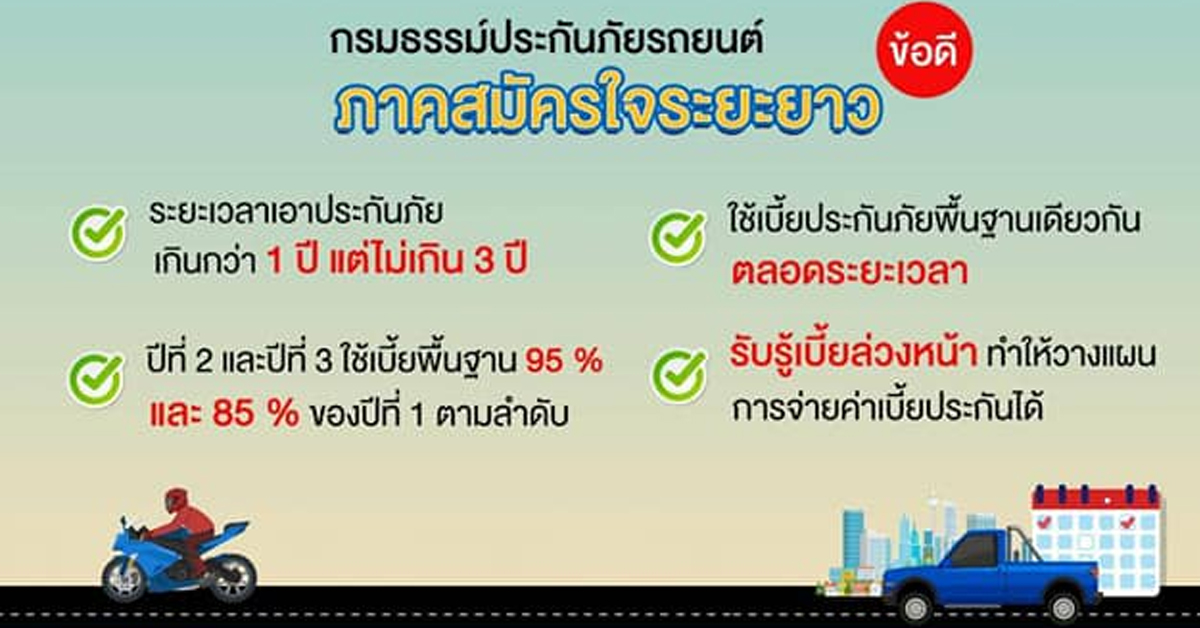 นอกจากนี้ บริษัทอาจออกกรมธรรม์ประกันภัยรถยนต์ระยะยาวให้แก่ผู้เอาประกันภัย โดยกรมธรรม์ประกันภัยมีระยะเวลาเอาประกันภัยเกินกว่า 1 ปี แต่ไม่เกิน 3 ปี และใช้เบี้ยประกันภัยพื้นฐานเดียวกัน ตลอดระยะเวลาคุ้มครอง โดยปีที่ 2 และปีที่ 3 ใช้เบี้ยพื้นฐาน 95% และ 85% ของปีที่ 1 ตามลำดับ ซึ่งจะสามารถตอบโจทย์ของผู้เอาประกันภัยที่ต้องการจัดทำกรมธรรม์ประกันภัยรถยนต์ระยะยาวได้ รวมถึงบริษัทอาจออกกรมธรรม์ประกันภัยรถยนต์ตามพระราช บัญญัติคุ้มครองผู้ประสบภัยจากรถฯ ที่มีระยะเวลาเอาประกันภัยเกินกว่า 1 ปี แต่ไม่เกิน 3 ปี โดยให้ใช้อัตราเบี้ยประกันภัยแบบเฉลี่ย ซึ่งจะเป็นประโยชน์ทำให้อัตราเบี้ยประกันภัยไม่เพิ่มขึ้นตลอดระยะเวลาเอาประกัน ทั้งนี้ คำสั่งนี้ให้มีผลบังคับใช้สำหรับการทำสัญญาประกันภัยกับบริษัทตั้งแต่วันที่ 22 เมษายน 2563 จนถึงวันที่ 31 ธันวาคม 2563