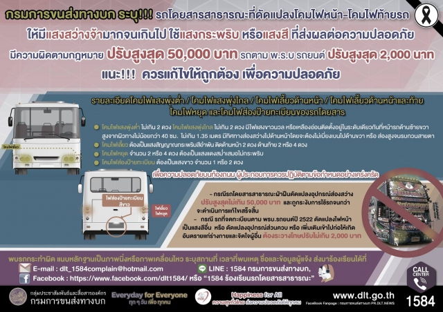 ล่าสุด กรมการขนส่งทางบก ออกมาระบุ ! รถโดยสารสาธารณะที่ดัดแปลงโคมไฟหน้า-โคมไฟท้ายรถ ให้มีแสงสว่างจ้ามากจนเกินไป ใช้แสงกะพริบ หรือแสงสีต่างๆ ที่ส่งผลต่อความปลอดภัย มีความผิดตามกฎหมาย ปรับสูงสุด 50,000 บาท ส่วนรถตาม พ.ร.บ.รถยนต์ ปรับสูงสุด 2,000 บาท แนะ ! แก้ไขให้ถูกต้อง