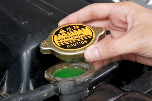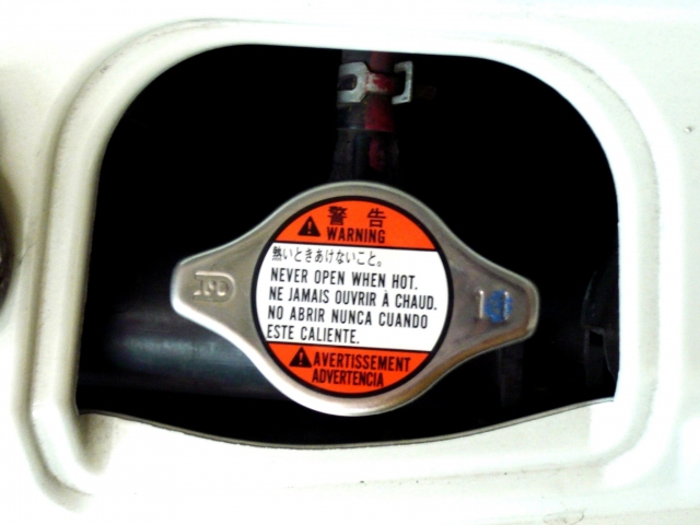When opening the cap to check or add water, do not do so while it is still hot, as the water pressure could cause injury. The correct procedure is to check and add water at the reservoir instead.