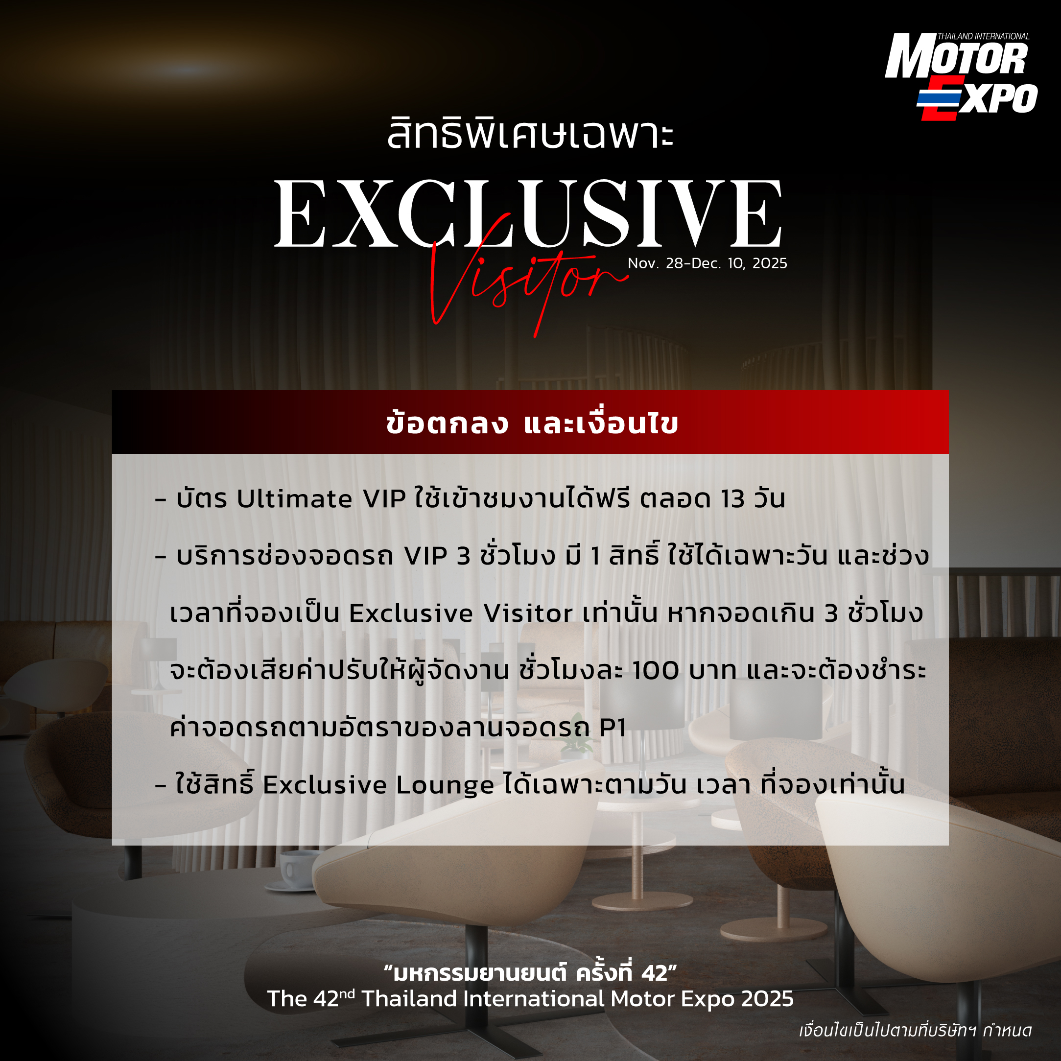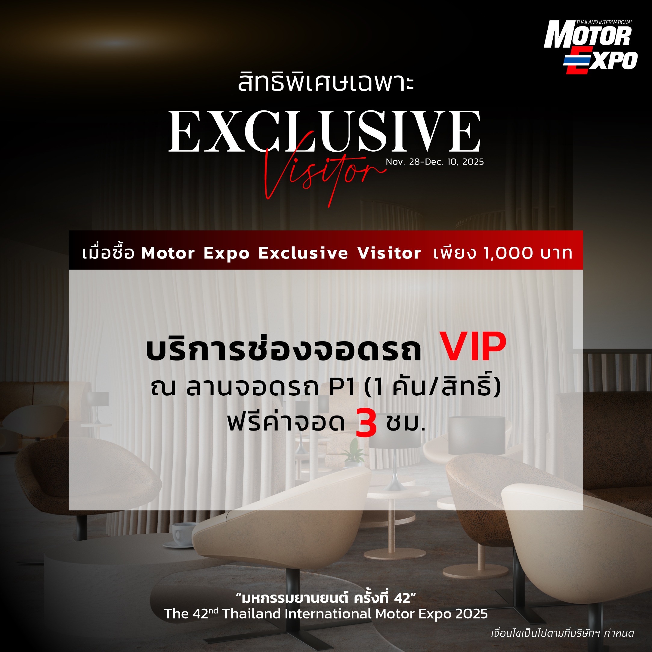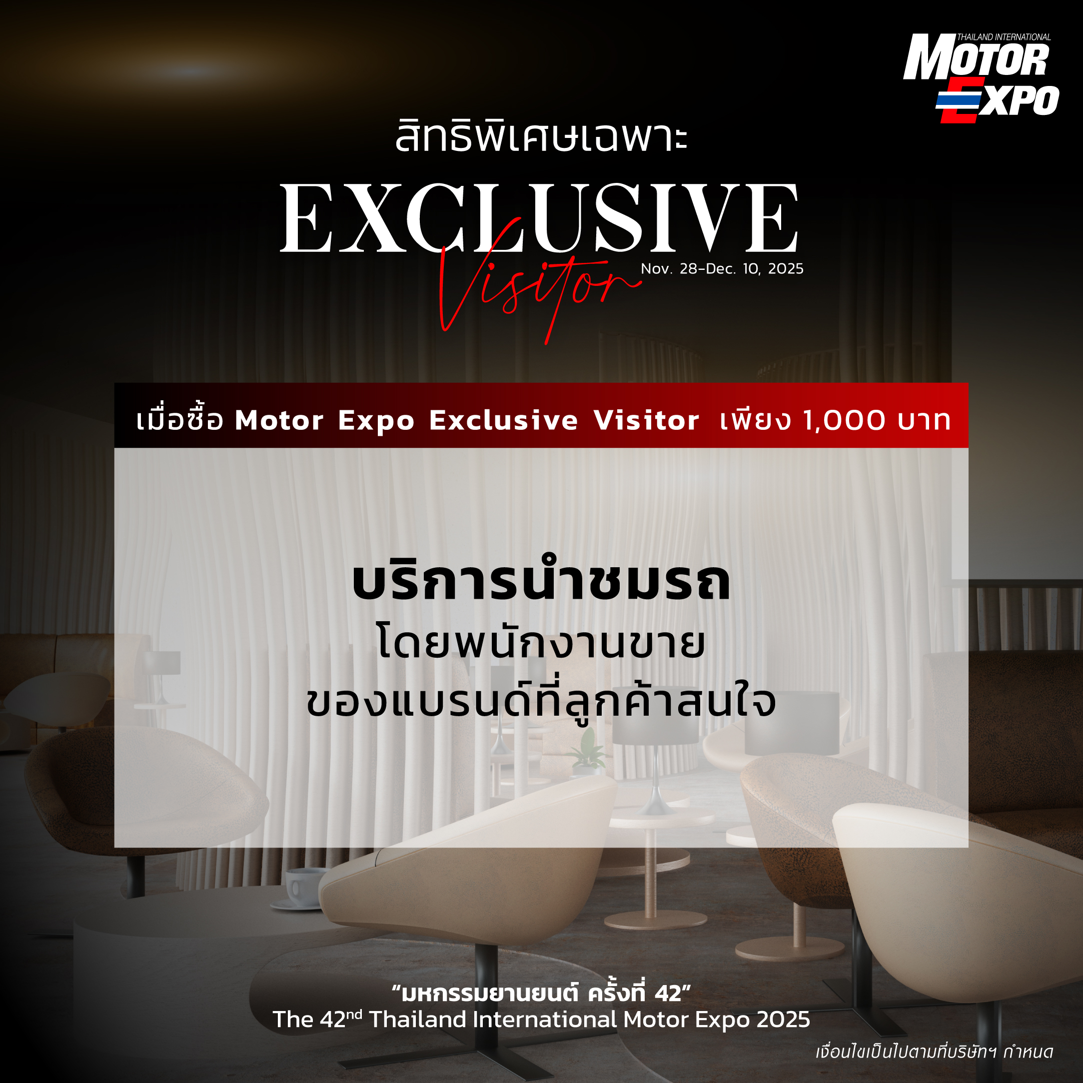* Receive the privilege to use the Exclusive Visitor Lounge at Motor Expo 2025, including snacks and drinks for 1 person.