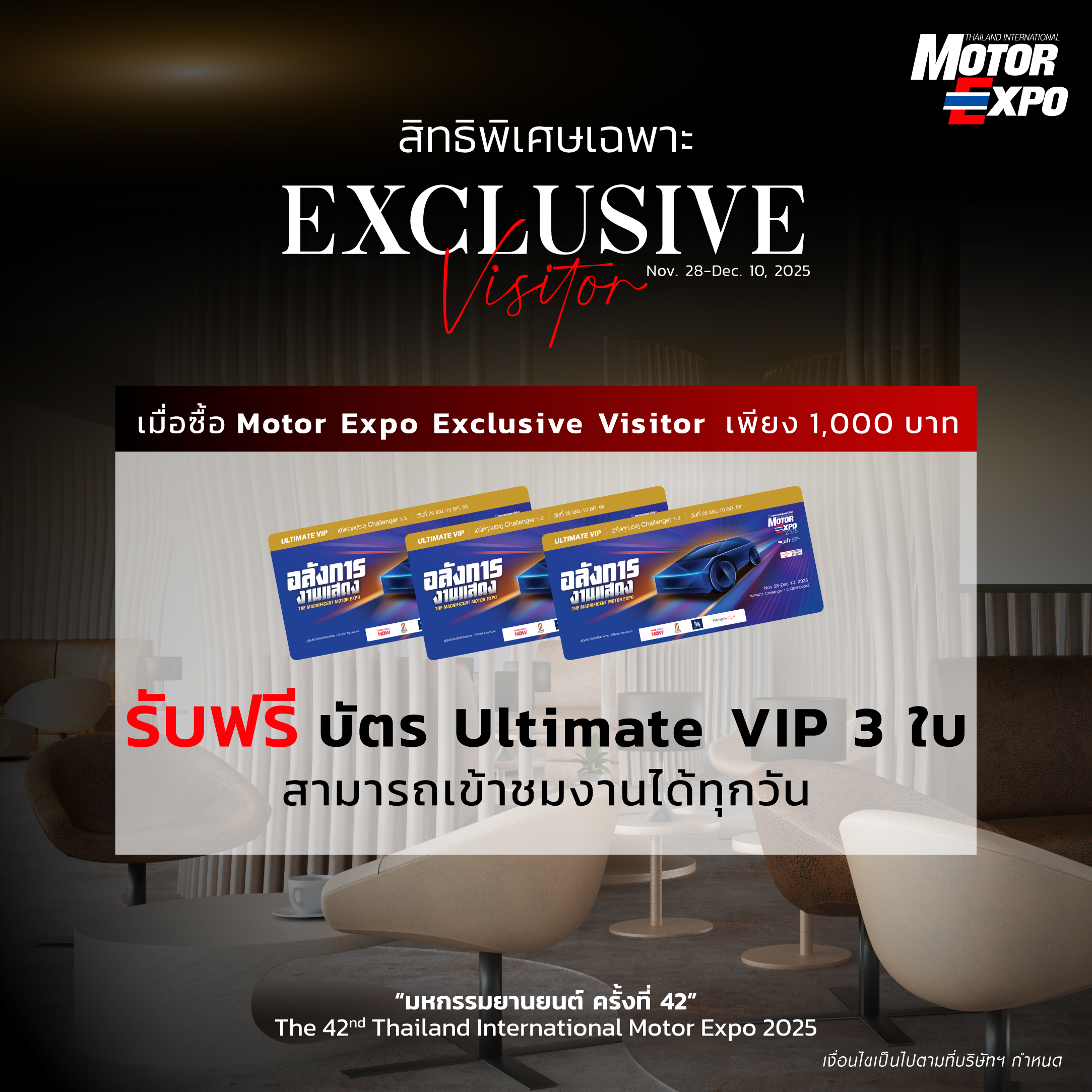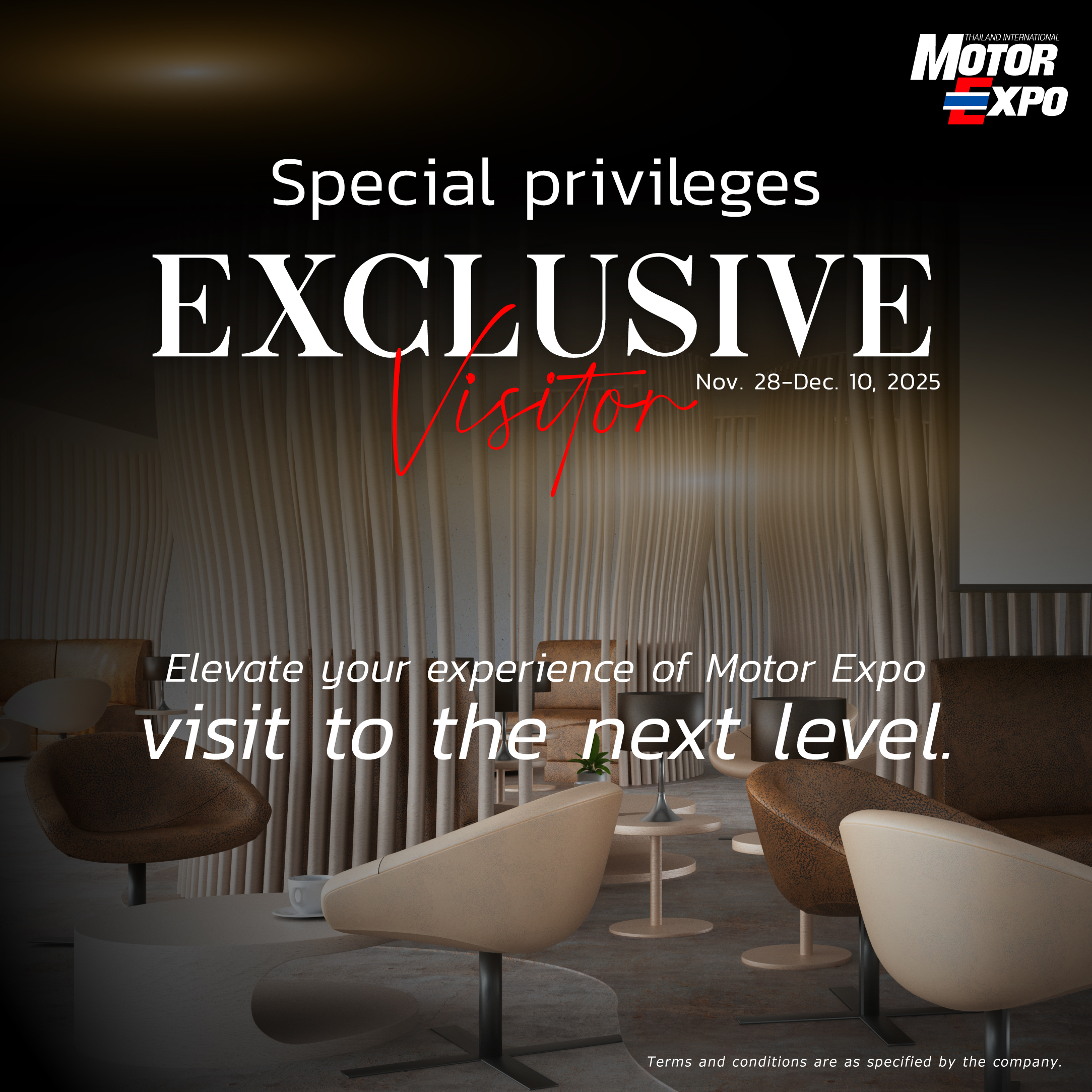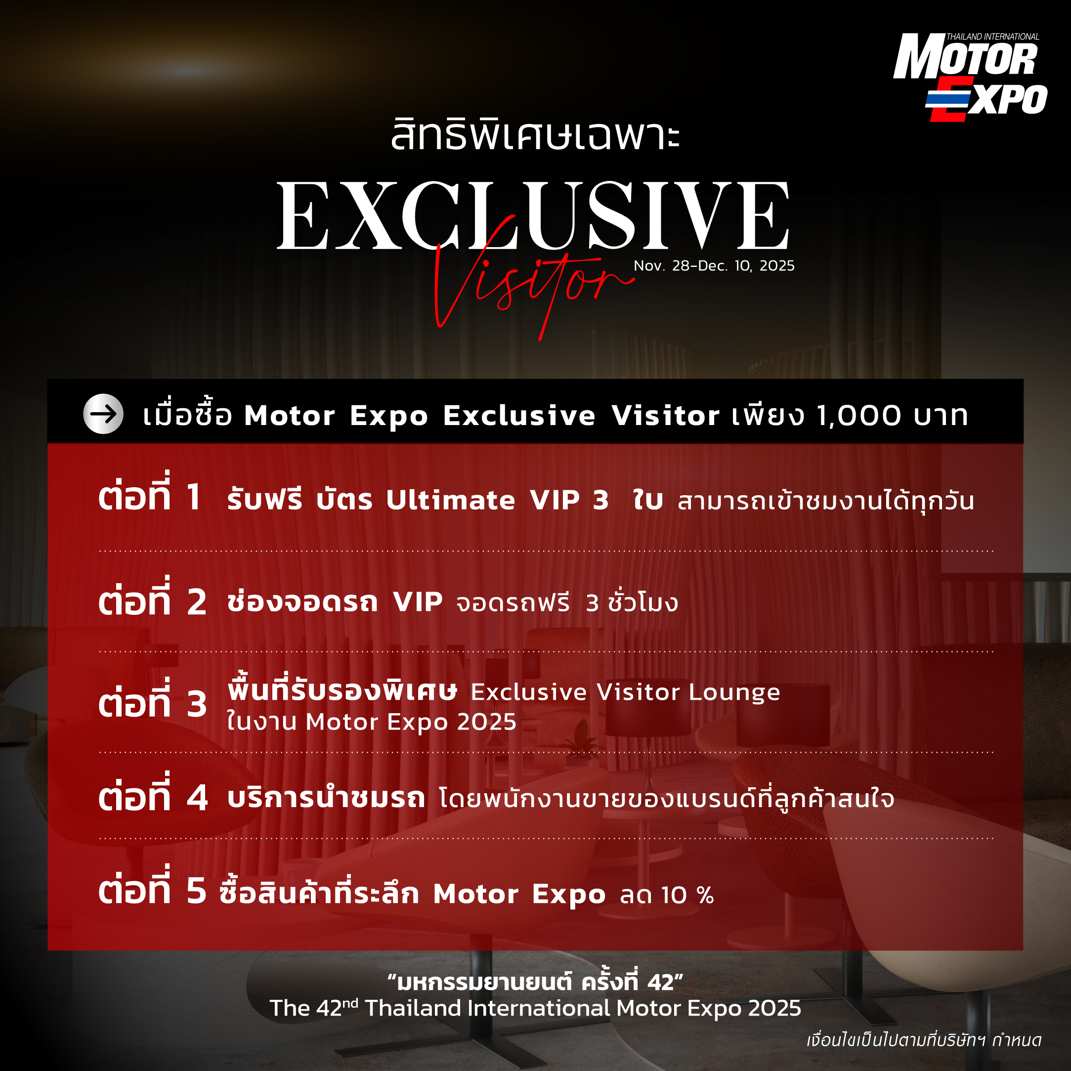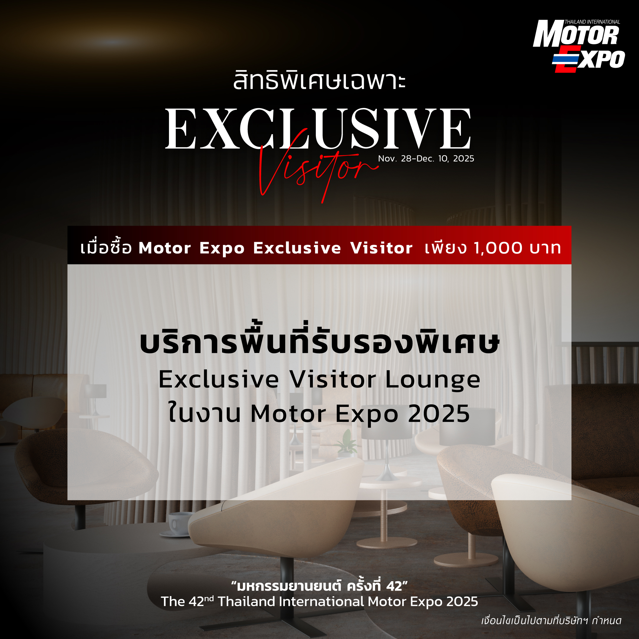 * Receive the privilege to use the Exclusive Visitor Lounge at Motor Expo 2025, including snacks and drinks for 1 person.