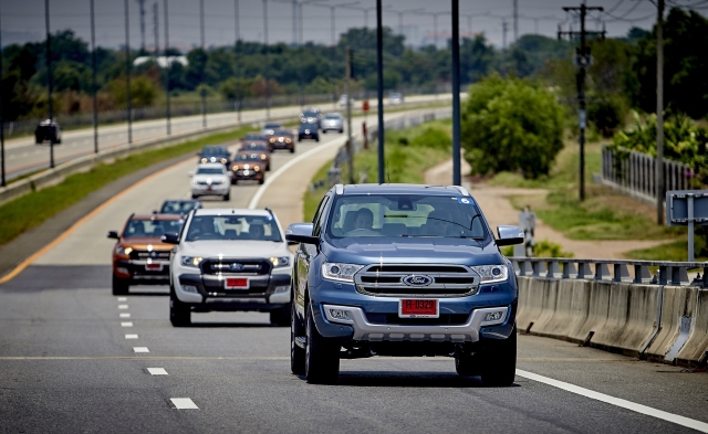 เราเริ่มการเดินทางกับกระบะ RANGER แต่อุปกรณ์ดังต่อไปนี้มีติดตั้งในเอสยูวี EVEREST เช่นกัน ได้แก่ ระบบควบคุมความเร็วแบบรักษาระยะห่างอัตโนมัติ (ADAPTIVE CRUISE CONTROL) นับเป็นครั้งแรกของรถกระบะที่มีระบบนี้ติดตั้งมาให้ ผู้ขับสามารถตั้งความเร็ว รวมถึงระยะห่างจากรถคันหน้า (คำนวณเป็นระยะเวลาที่เข้าหารถคันหน้า) ได้ตามต้องการ หากระบบพบว่ารถคันหน้าขับช้ากว่าความเร็วที่ถูกตั้งเอาไว้ รถจะชะลอความเร็วลงให้เท่ากับรถคันหน้าโดยอัตโนมัติ ทิ้งระยะห่างอย่างเหมาะสม หากรถคันหน้าเปลี่ยนเลนออกไป หรือเราเปลี่ยนเลนเพื่อแซง ความเร็วก็จะเพิ่มขึ้นจนถึงตัวเลขที่เราตั้งค่าเอาไว้ โดยอัตโนมัติเช่นกัน การชะลอความเร็วใช้การเบรค (ไฟเบรคยังขึ้นตามปกติ เพื่อรถคันหลังจะได้มองเห็น) และลดการส่งกำลังของเครื่องยนต์บางส่วน ต่างจากระบบครูส คอนโทรล ทั่วไปที่สามารถรักษาความเร็วให้คงที่เท่านั้น แต่ผู้ขับต้องทำการชะลอความเร็วด้วยตนเอง