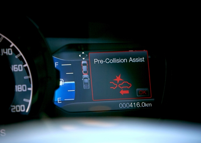 ถัดมา คือ ระบบเตือนการชนด้านหน้า (FORWARD COLLISION WARNING SYSTEM) ทำงานที่ความเร็ว 5 กม./ชม. ขึ้นไป ผู้ขับสามารถตั้งค่าระยะเวลาความห่างจากรถคันหน้าได้ (ไม่ใช่ระยะทางโดยตรง เพราะระบบจะคำนวณเวลาการเข้าหารถคันหน้า ขึ้นอยู่กับความเร็วที่รถแล่นด้วย) หากรถแล่นเข้าใกล้รถคันหน้ามากขึ้น ในเบื้องต้นระบบจะแจ้งเตือนด้วยแถบไฟแอลอีดีสีแดง สะท้อนแสงผ่านกระจกหน้า แต่หากรถยังแล่นเข้าใกล้จนอยู่ในระยะอันตราย แถบไฟจะขึ้นเตือนครบทุกดวง พร้อมกับการเตือนด้วยเสียงอีกทีหนึ่ง นอกจากนี้หากอยู่ในระยะกระชั้นชิด ระบบจะเพิ่มแรงดันน้ำมันเบรครอเอาไว้ล่วงหน้า เพื่อให้ผู้ขับสามารถเบรคฉุกเฉิน เลี่ยงการปะทะได้ทันเวลา