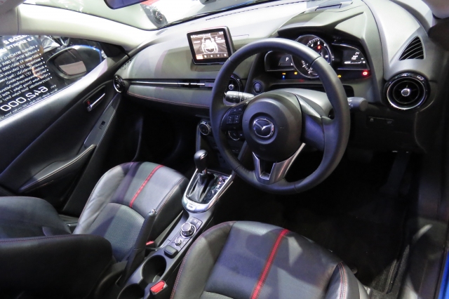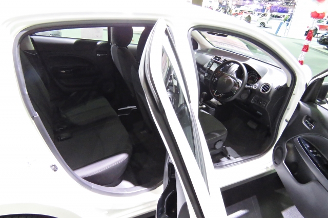 ขนาดตัวที่แตกต่างกันย่อมส่งผลต่อพื้นที่ห้องโดยสารอย่างเลี่ยงไม่ได้ ทำให้ MAZDA 2 ยังคงมีห้องโดยสารที่กว้างขวางกว่า MIRAGE อีกทั้งระดับราคาโดยรวมที่สูงกว่า ทำให้ MAZDA 2 มีการตกแต่งที่ใช้วัสดุสมราคา (ในรุ่นทอป) สปอร์ทเร้าใจ ตามแบบฉบับรถยนต์จากค่ายรถแห่งนี้ ส่วน MIRAGE เน้นความเรียบง่าย แต่อัพเกรดวัสดุตกแต่งให้ดูดีขึ้น แถมยังติดตั้งจอภาพระบบสัมผัสขนาด 6.2 นิ้ว (รุ่น GLS-LTD มีขนาด 6.5 นิ้ว) พร้อมเครื่องเล่น DVD มาตั้งแต่รุ่น GLX MT