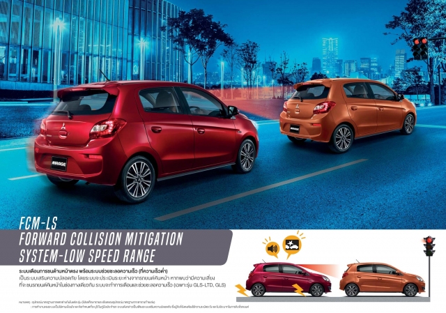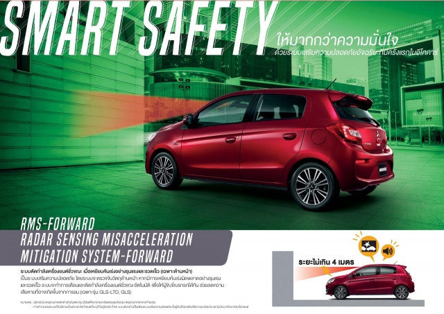 MIRAGE มีระบบความปลอดภัยเกินหน้าคู่แข่งระดับเดียวกัน หรืออาจรวมทั้งรถยนต์ขนาดใหญ่กว่า และแพงกว่า ด้วยซ้ำ !! ด้วยระบบชะลอความเร็วอัตโนมัติเมื่อพบสิ่งกีดขวางด้านหน้า และระบบตัดกำลังเครื่องยนต์ชั่วครู่ขณะออกตัวและมีการเหยียบคันเร่งอย่างรุนแรงขณะมีสิ่งกีดขวางข้างหน้า ระบบความปลอดภัยที่ว่ามามีติดตั้งในรถเอสยูวีร่วมค่ายอย่าง PAJERO SPORT นั่นเอง แม้จะมีติดตั้งเฉพาะรุ่นทอป GLS-LIMITED แต่กับราคาที่ 560,000 บาท ถือว่าคุ้มค่าไม่น้อย