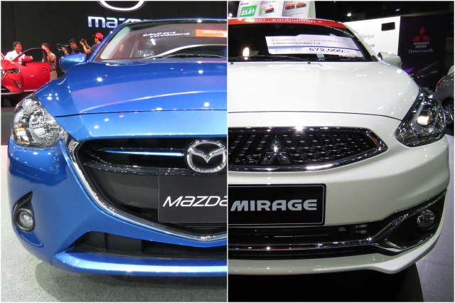 ถึงจะเป็น ECO CAR PHASE 2 เหมือนกัน มีความประหยดใกล้เคียงกัน แต่ทั้ง MAZDA 2 และ MIRAGE ก็มียังความแตกต่างกันพอสมควร ทางฝั่ง MAZDA มีขนาดตัวที่ใหญ่กว่า การตกแต่งห้องโดยสารดีกว่า สมกับค่าตัวโดยรวมที่สูงกว่าด้วย ส่วน MIRAGE อัพเกรดตัวเองขนานใหญ่ ยกระดับความประหยัด และระบบความปลอดภัยเกินหน้าเกินตา แต่ตัวถังมีขนาดเล็กกว่าอย่างเห็นได้ชัด อีกทั้งทำตลาดมาระยะหนึ่งแล้ว แม้จะเพิ่งปรับโฉมก็ตาม