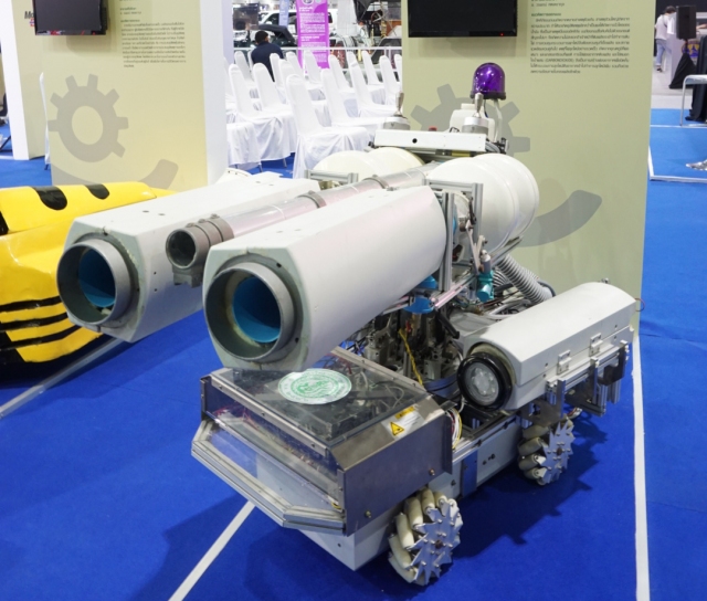 ผลงาน Firefighter Robot (หุ่นยนต์สกัดการลุกลามอัคคีภัย) โดย ศิรินาท ทรัพย์ชื่น กิตติธัช จึงมานะกิจ ปิยวัตร เกิดผล รุจิพงษ์ สุขทรัพย์ พงศ์ศิริ แก้วทวี จิตรภานุ อุเทน และพิชญุตม์ อุไรจารี จากมหาวิทยาลัยเกษตรศาสตร์
