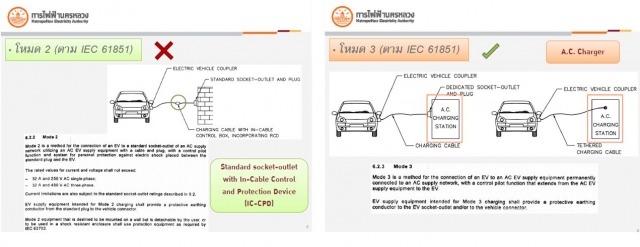 การไฟฟ้านครหลวง แนะนำว่าการชาร์จที่บ้านควรใช้เครื่อง Wallbox EV Charger (เครื่อง Mode 3) เพื่อความปลอดภัย ซึ่งรับกระแสไฟได้ 16-32 A สามารถชาร์จได้เต็มประสิทธิภาพของรถยนต์แต่ละรุ่น และมีระบบตัดไฟเมื่อชาร์จเต็ม หรือเมื่อเกิดเหตุฉุกเฉิน เช่น กระแสไฟเกิน ความร้อนเกิน (มี Over-Current and Thermal Protection)