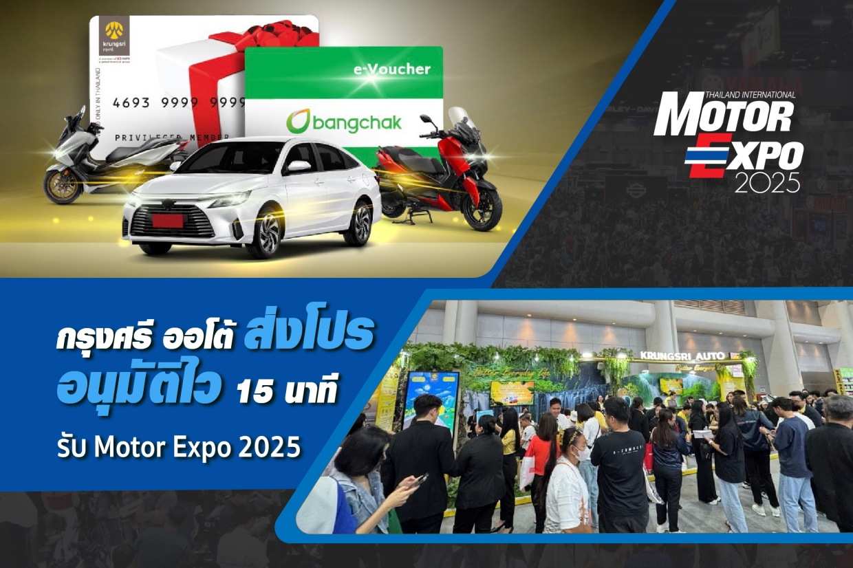 พิเศษ ! สำหรับลูกค้าใหม่ทั้งรถยนต์ และบิกไบค์ กรุงศรี ออโต้ ตอบรับยุคดิจิทอล มอบผลอนุมัติไวภายใน 15 นาที ผ่านกรุงศรี ออโต้ พร้อมสตาร์ท สินเชื่อยานยนต์ดิจิทอล ผู้ที่สนใจสามารถเยี่ยมชมและขอสินเชื่อได้ที่บูธ กรุงศรี ออโต้ (V20-V24) ตลอดทั้ง 12 วัน ในงาน Motor Expo 2025 ระหว่างวันที่ 29 พฤศจิกายน-10 ธันวาคม 2568 ณ IMPACT ชาลเลนเจอร์ ฮอลล์ 2 เมืองทองธานี