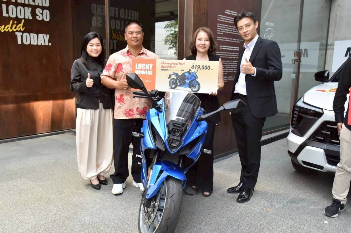 วราทิพย์ คำนึงคุณ กรรมการผู้จัดการ บริษัท มอเตอร์ไซเคิล เอ็กซ์โป จำกัด และ อัญมฯี เศรษฐนันท์ มอบรางวัลรายการ “ซื้อมอเตอร์ไซค์...ชิงบิกไบค์” Suzuki รุ่น GSX-8R มูลค่า 419,000 บาท ผู้ได้รับรางวัล ได้แก่ รัชพล แช่มจันทร์ จังหวัดตาก